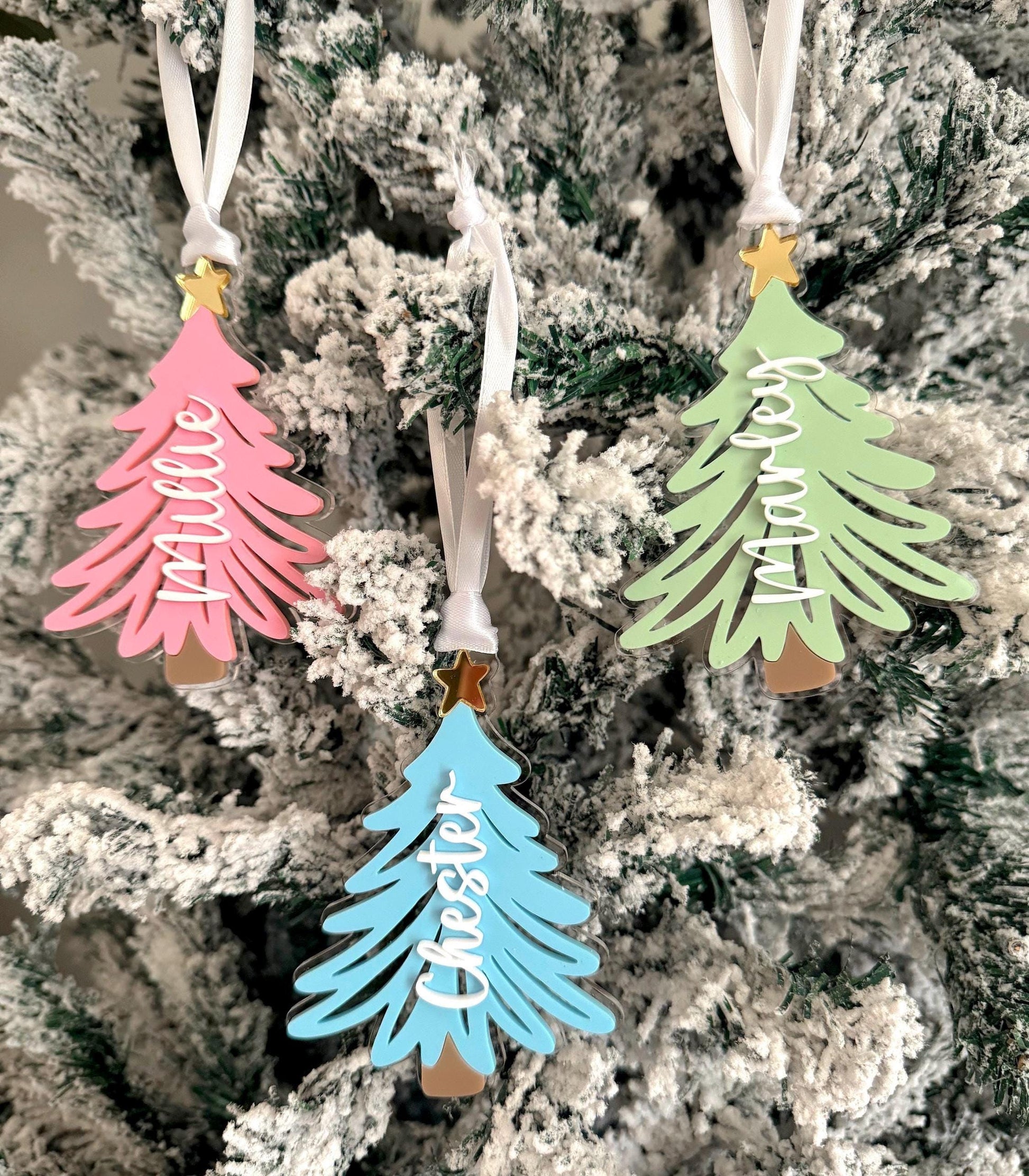 Crafted to dazzle, each ornament features a gold star topper and your choice of vibrant tree colour, set against a sleek clear acrylic backing that lets the light on your tree shine through.