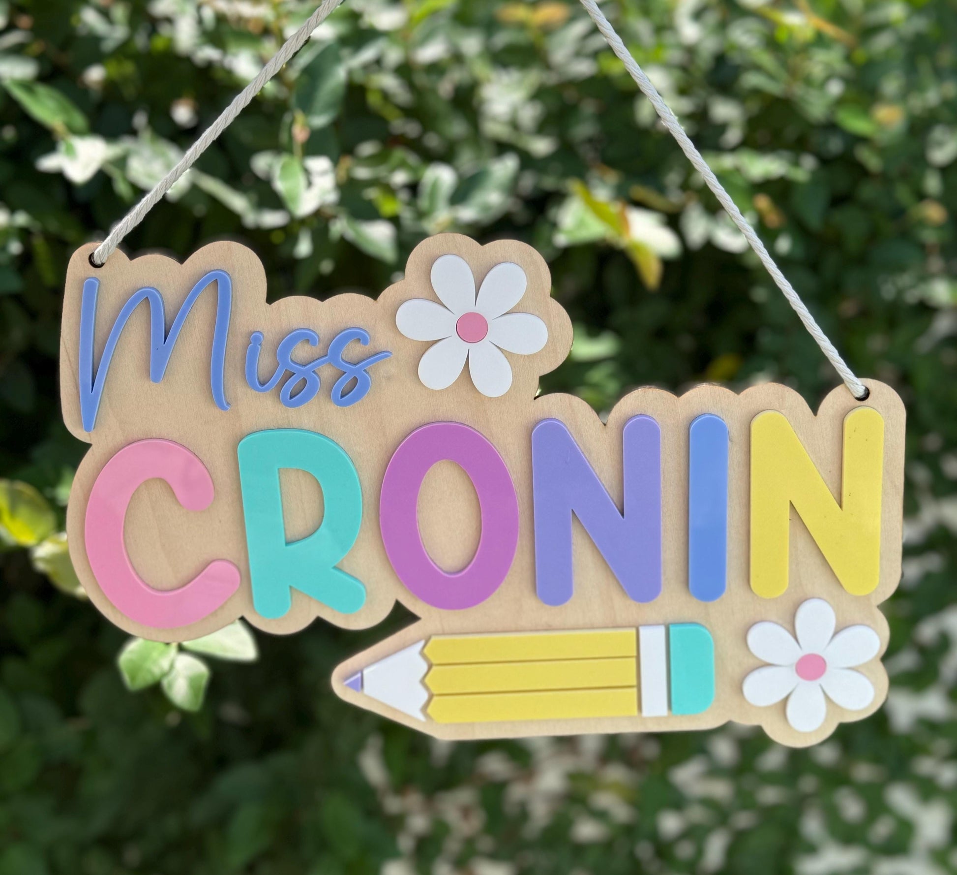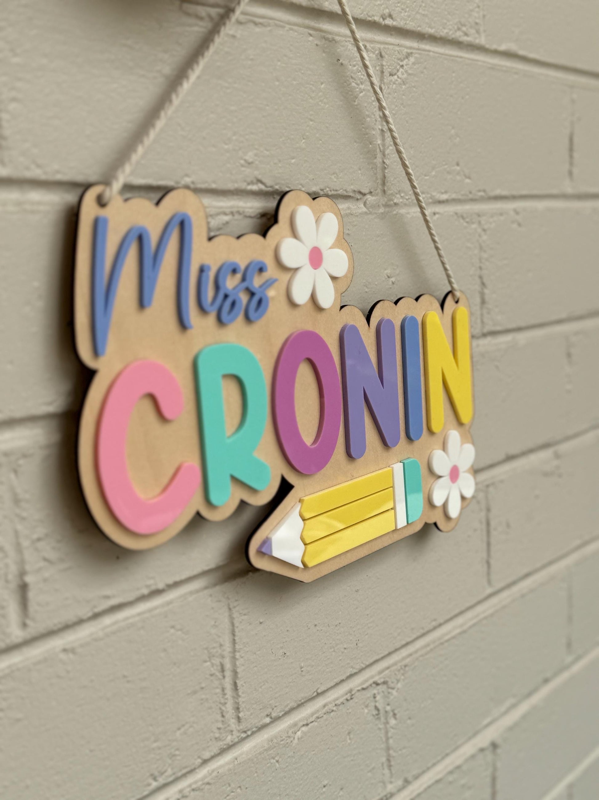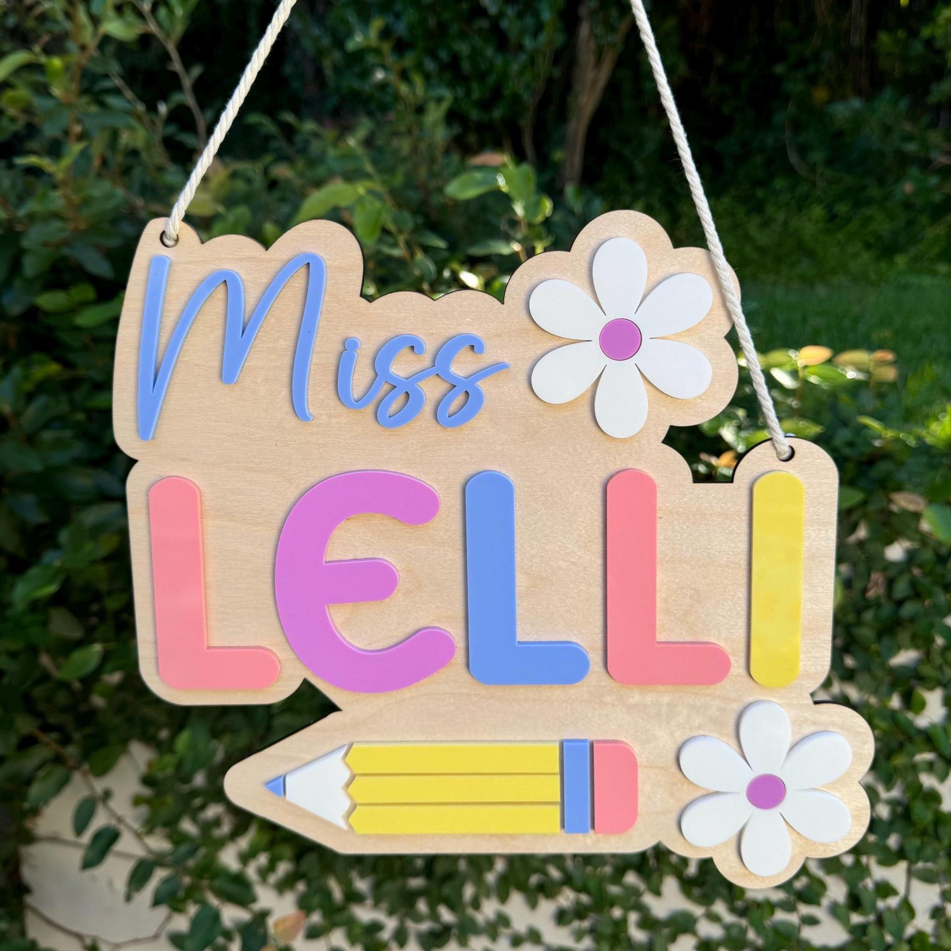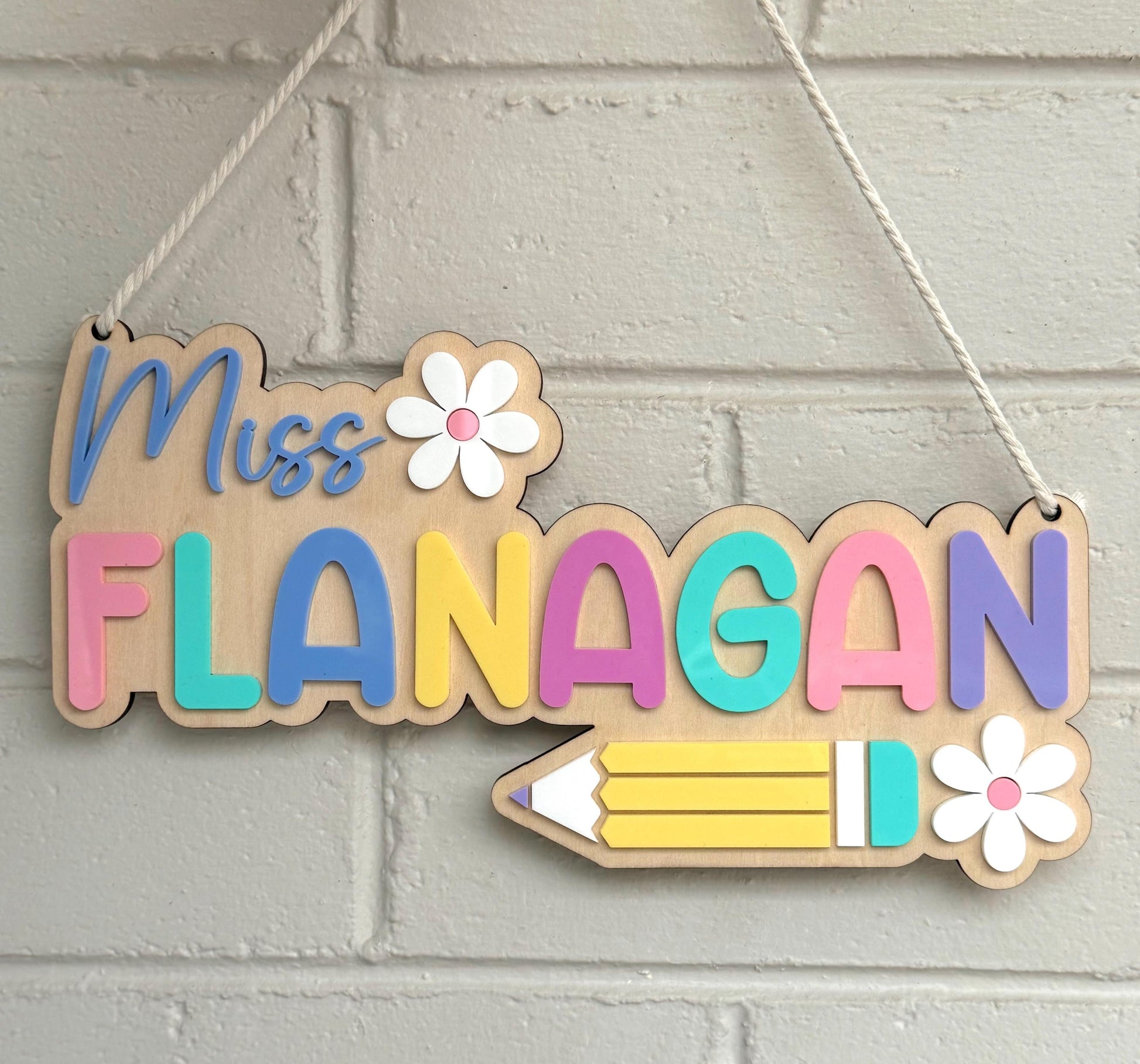Personalised with the teacher's name, is ideal for any room, door, office, or classroom. It features vibrant, high-quality acrylic letters on wood.