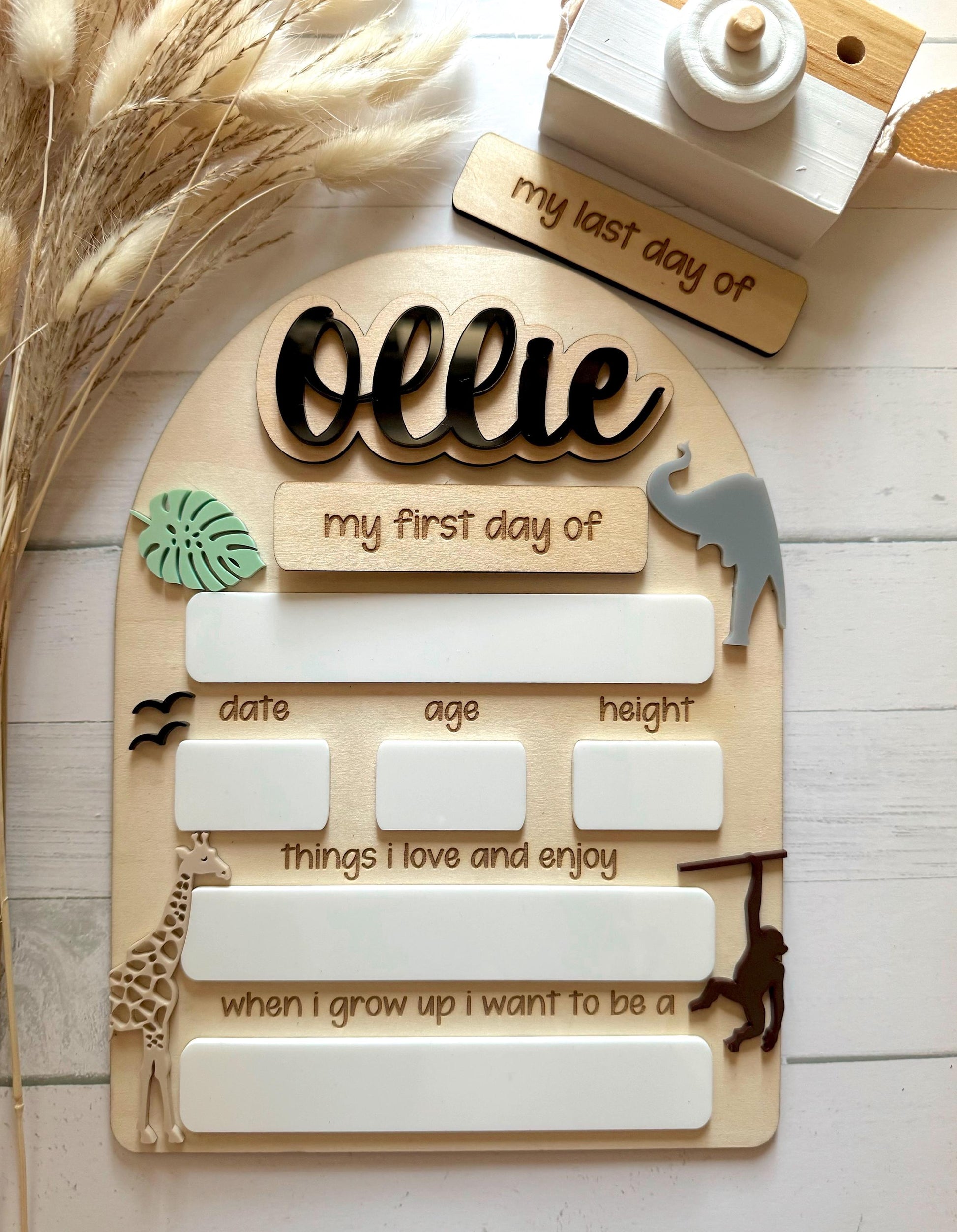 Both "My First Day Of" and "My Last Day Of" are attached to the board with velcro dots, offering a safe and convenient alternative to magnets.