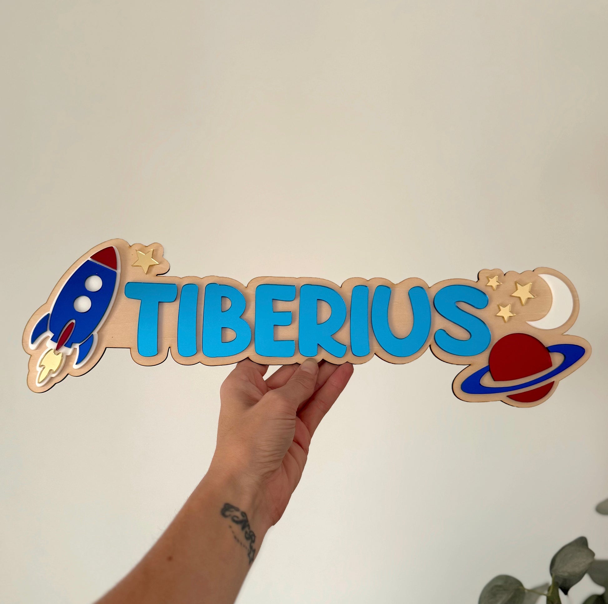 Each plaque is fully customisable. Select one colour for the name, one for the rocket, and one for the planet sphere. Your chosen colours will be incorporated throughout the design. The stars and rocket flames will feature a gold mirror finish, while the moon and the rocket’s backing will be white.